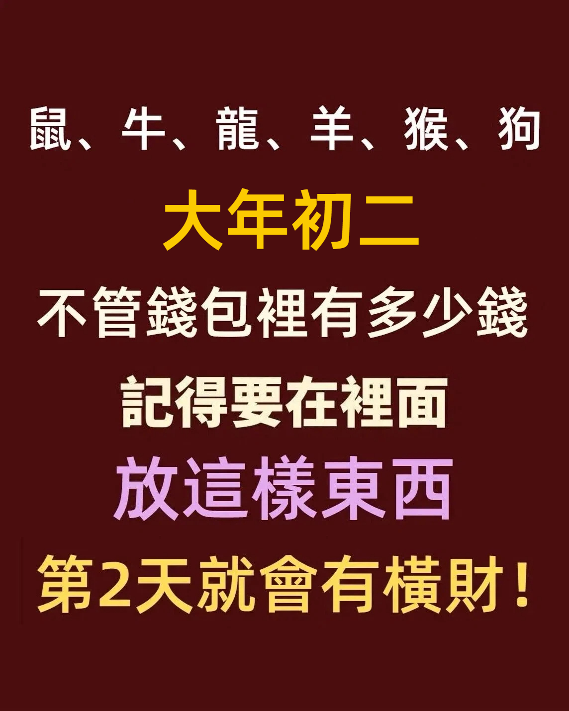 🧧大年初二財神報到! 「鼠、牛、龍、羊、猴、狗」這6生肖注意了 👉 錢包裡放對東西,第2天真的有機會