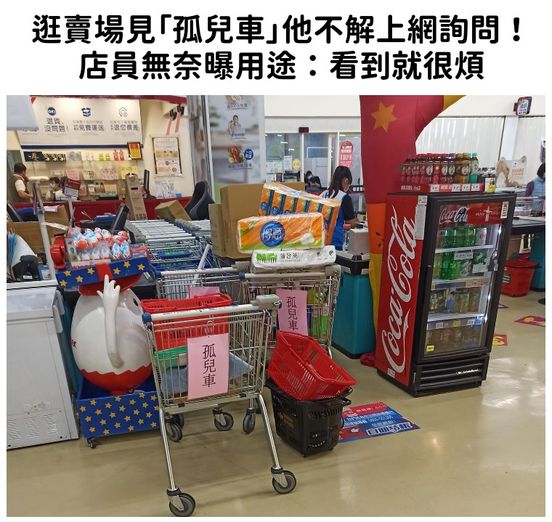 你在大賣場見過這景象嗎?近日有網友到賣場採購商品時,發現多部手推車被貼上「孤兒車」的字條,讓他不禁好