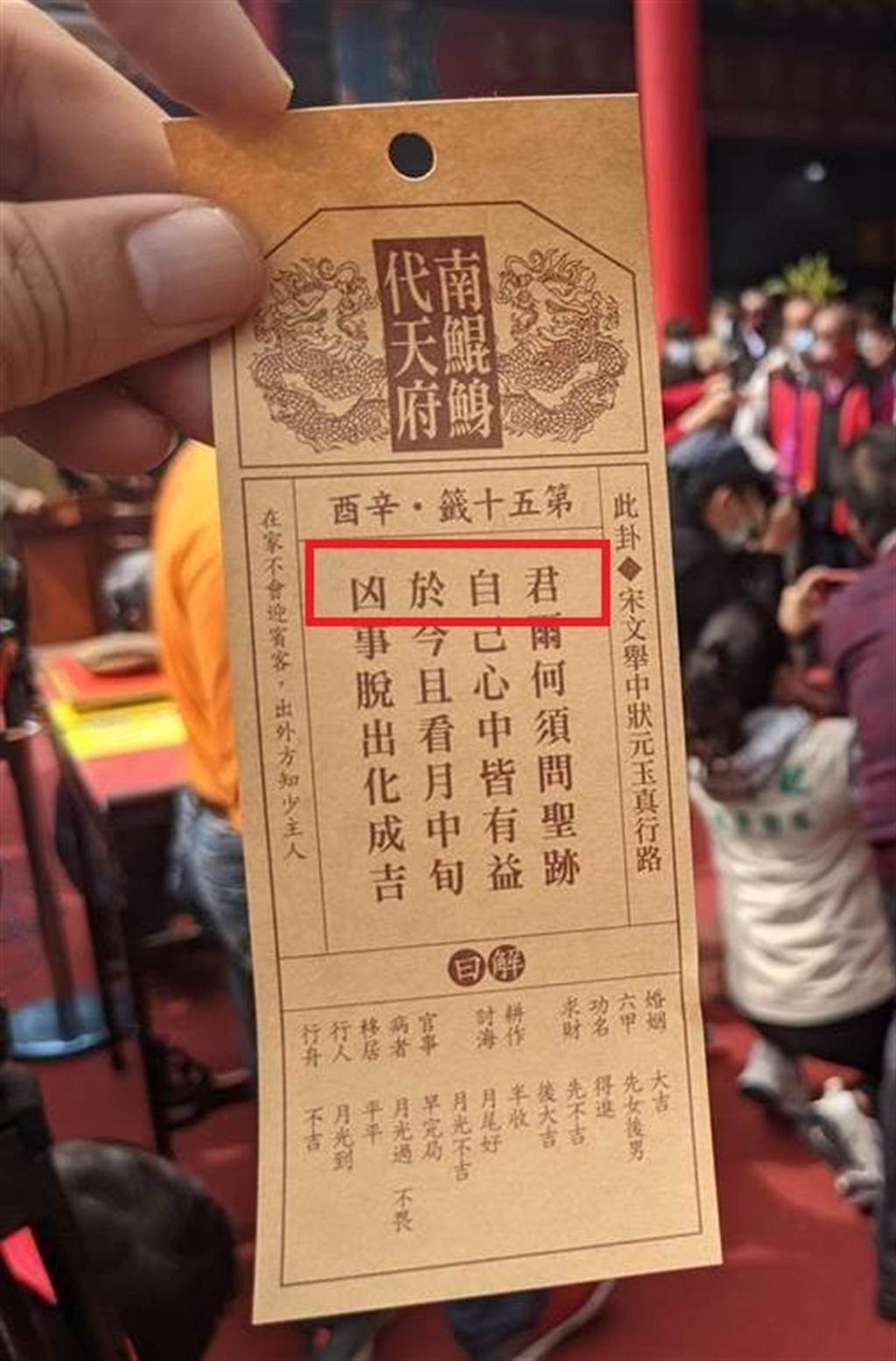 台南南鯤鯓代天府大年初一(2月12日)抽出第50籤「辛酉國運籤」,籤詩為「君爾何須問聖跡,自己心中皆