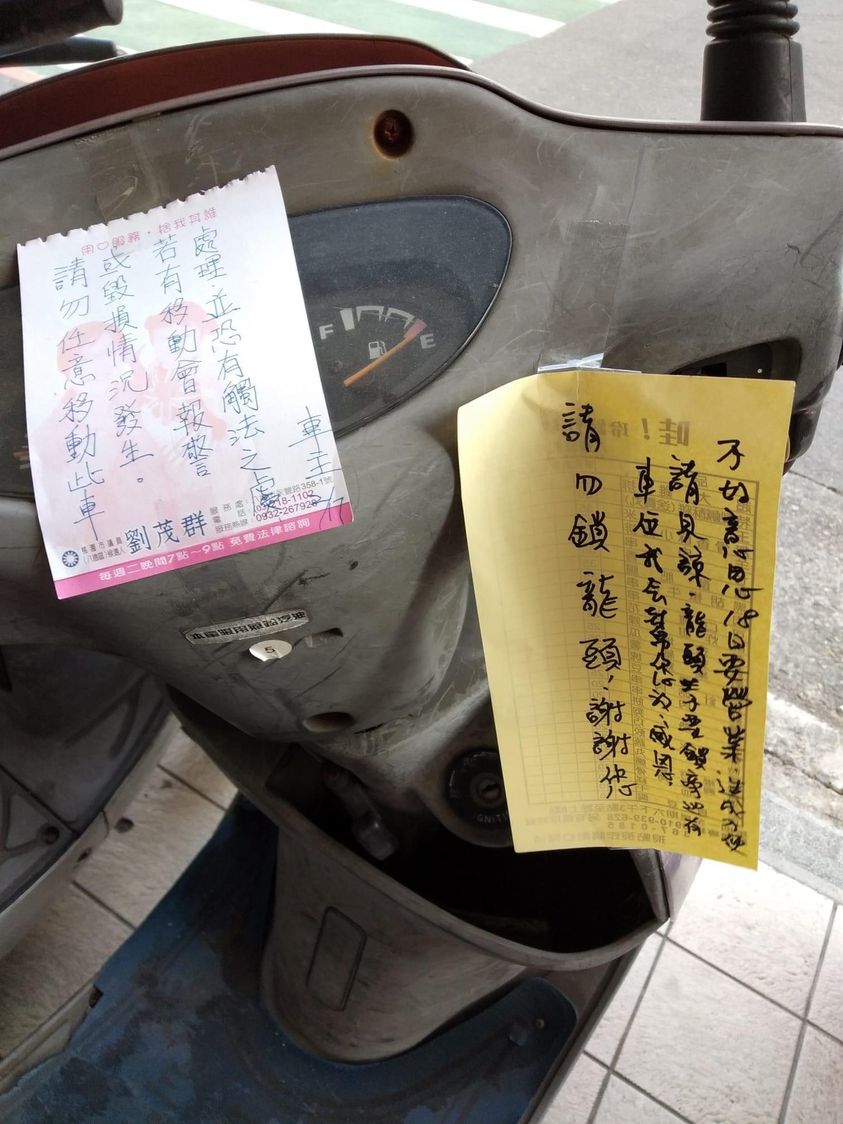 網友在臉書社團上分享一張照片: 指出有人將機車停在店前騎樓 留紙條請對方不要鎖龍頭 如果旁邊有免費停
