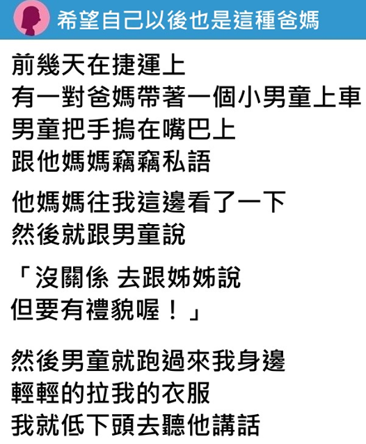 一名女網友日前搭捷運時,被一位弟弟發現褲子拉鍊沒拉;重點是,在父母的指導下,弟弟很懂事地快速上前,在