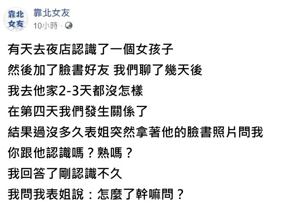 一名男網友在臉書社團PO文,表示在夜店認識了一位妹子加了臉書、聊了幾次天,還去了對方家裡,終於在第4