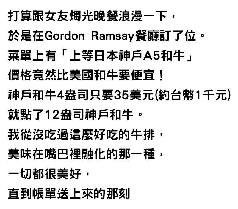 去餐廳吃飯時一定要看好菜單,否則可能會付出極大的代價! 美國一名男子和女友到「英國廚神」戈登(Gor