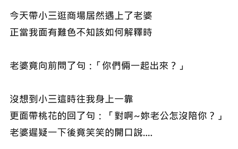 今天特地跟老婆說謊,陪我最愛的小三逛商場,沒想到逛著逛著…..居然碰上了我們家那隻母老