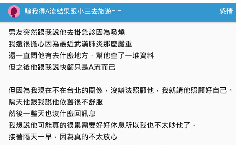 一名女網友在迪卡上po文敘述自己被男友劈腿從發現到分手的過程… ̵