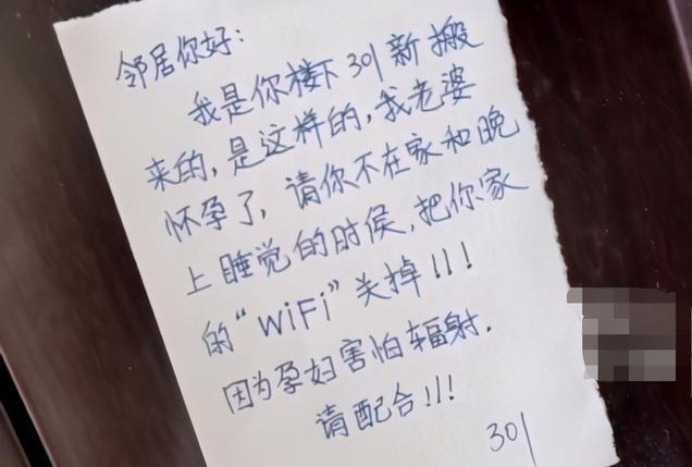 大陸一名住戶回家時,看到大門被樓下鄰居貼了一張手寫信,紙條上寫道,「請不在家和晚上睡覺時關掉WiFi