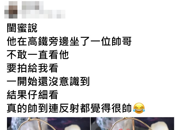 有女網友搭高鐵時豔遇,發現後方座位有一位帥哥,即使戴著口罩也帥氣噴發,但因為害羞不敢直視,想跟閨蜜分