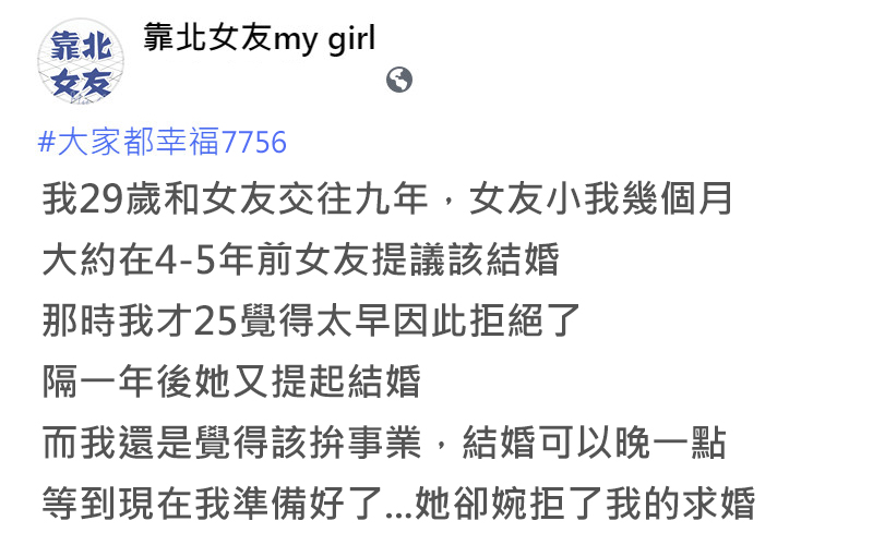 情侶攜手步入禮堂前必需先突破重重關卡! 近日有一名網友提到,前陣子交往9年的女友多次提起想結婚的想法