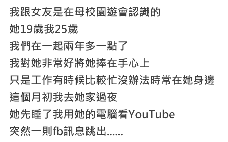 網友在臉書社團上發文 我跟女友在母校園遊會認識 她19 我25 我們在一起兩年多一點,