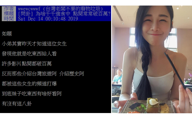 Youtuber「千千」,是台灣出了名的大胃王,曾赴日參加大胃王比賽並奪下亞軍,外型纖細且仙氣爆棚,