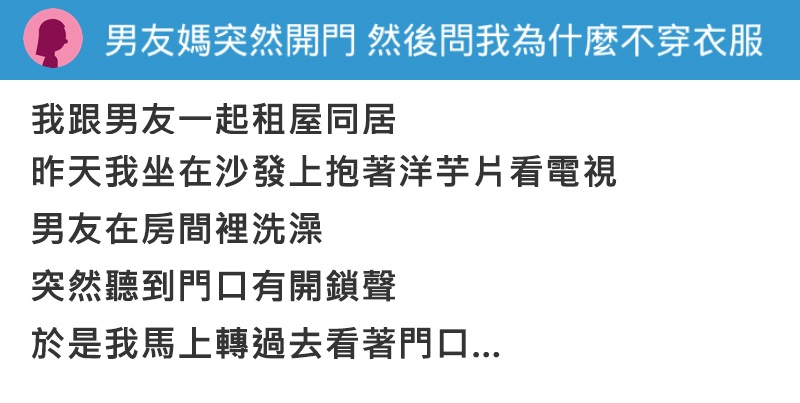 和男友在外同居,突然「男友媽打開」…她看了我怒問:為什麼不穿衣服? 是昨天發生的事,昨天