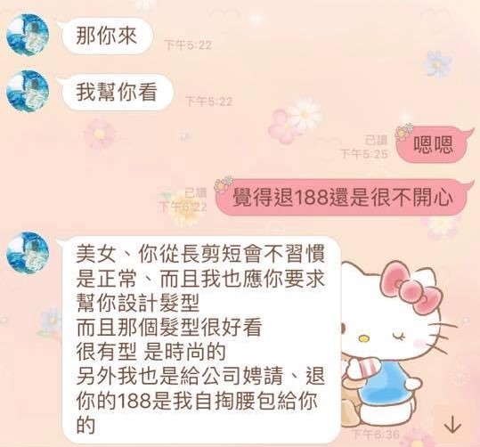 妹子不滿頭髮遭剪壞只退188元,要求店家賠償對話曝光…到底是誰的問題? 一名網友抱怨她的