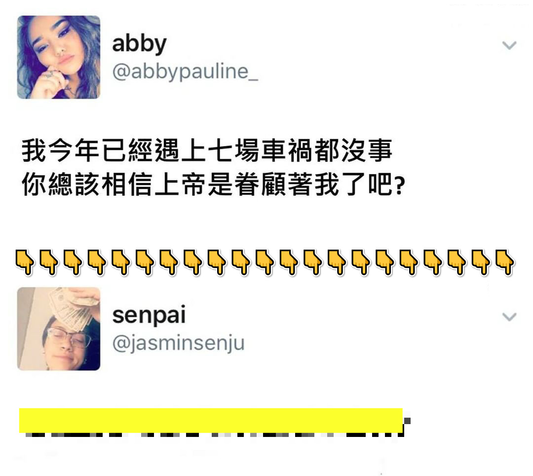 – 我看到我姊妹發 我今年已經遇上了七場車禍都沒事 我真的不忍心說破 但我還是說了