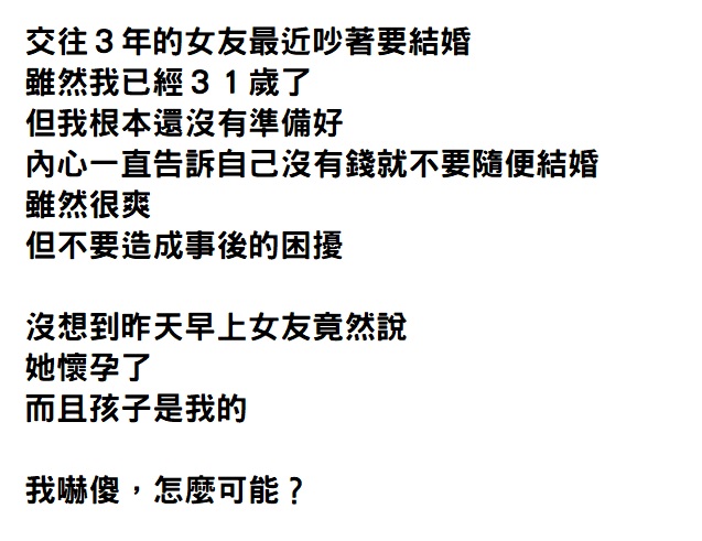 近日有男網友在臉書專頁「靠 北 女友」PO文,表示交往3年的女友突然說懷孕了要結婚,於是傳簡訊給女友