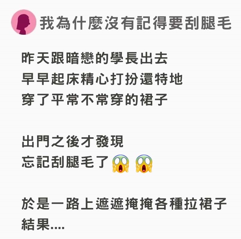 跟暗戀的學長出門約會卻忘了「刮腿毛」對方超猛神閃避讓她大崩潰 昨天跟暗戀的學長出去 早