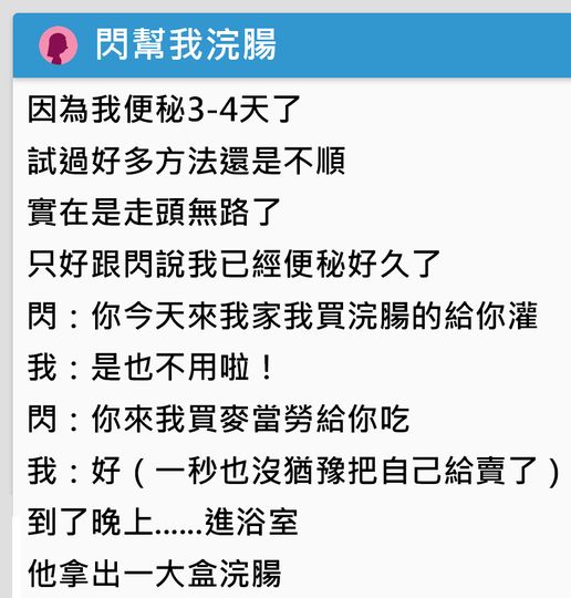 不知道大家如果便秘好幾天都怎麼辦呢? 有位女網友便祕好幾天跟男友說,結果男友做法真的讓她超羞恥但又超