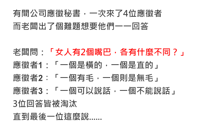 有間公司應徵秘書,一次來了4位應徵者,而老闆出了個難題想要他們一一回答! (圖/網路示意圖) 4為求