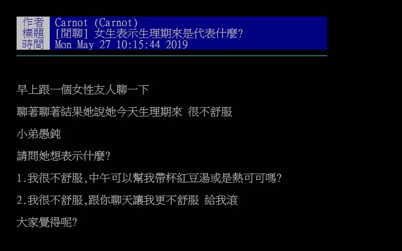 魯蛇和女生聊天被告知「我今天生理期來」急PO網求助!網友笑翻「超神分析」 (圖/PTT