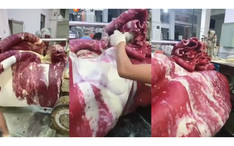 最近網路瘋傳一段影片,影片中工人正在機器上翻攪著牛肉色東西,更添加了白色的在裡面,影片標題寫著「Fa