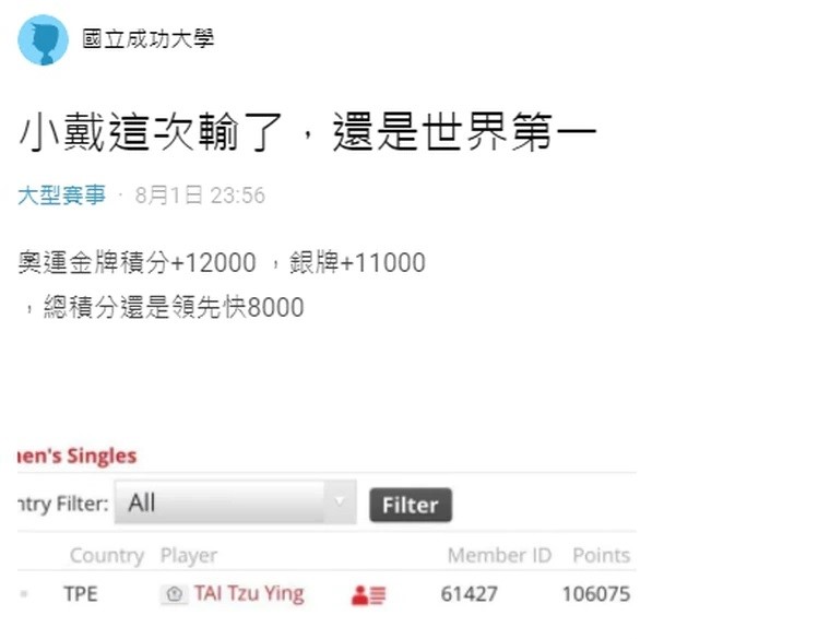 小戴「戴資穎」仍是世界第一!「創最多紀錄」穩坐世界球后寶座 「世界球后」戴資穎在東奧對決世界排名第2