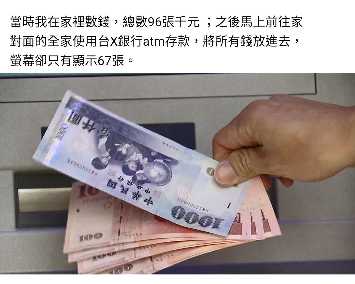 用ATM存9萬,「卻消失2萬9?」銀行強調:機器沒壞掉!警察也沒轍 有一名網友透露,她