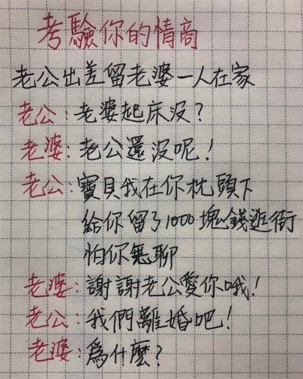 答: 枕頭底下根本沒放錢  因為他不在家   所以出軌了