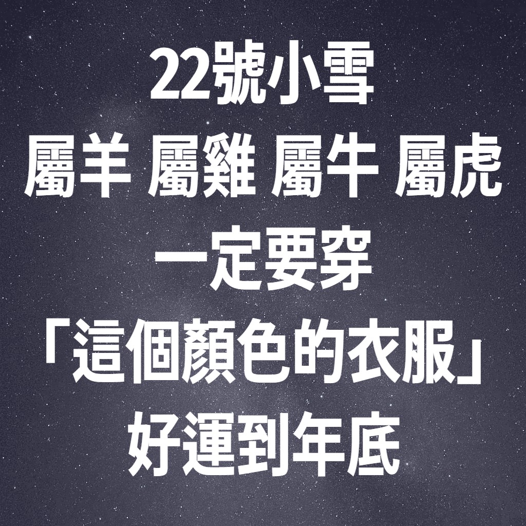 11 月 22 日「小雪」節氣,日氣為強土,但節氣主水。為了順應季節趨勢,穩定財富,這四個生肖最應該穿戴的轉運顏色是 藍色(水)和黑色(水)。