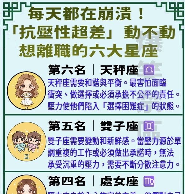抗壓性差的原因: 天秤座需要和諧與平衡。他們最害怕面臨衝突、做選擇或必須承擔不公平的責任。壓力使他們陷入「選擇困難症」的狀態。
