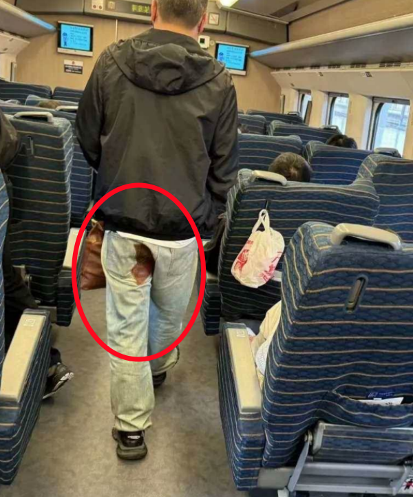 一位女子在車廂內偶然間注意到一位男子,他的後方好像有些不妥——從遠處看,他的褲子後部似乎有一片暗紅色的印跡,頗似血跡,讓人不由得關心起來。