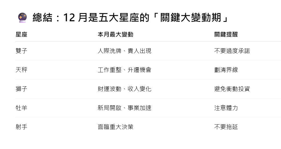 而 雙子、天秤、獅子、牡羊、射手 五個星座,更是這波「大變動」的核心主角,有人要迎來突破,也有人要面臨調整。