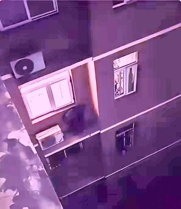 我越看越毛,忍不住把照片放大。男人穿著深色上衣,頭低低的,看起來是在往下方瞧。他看起來不像修東西的師傅,也不像什麼正常訪客——沒有安全繩、沒有工具,動作也不是在工作。反而更像是在……偷看?還是等誰?