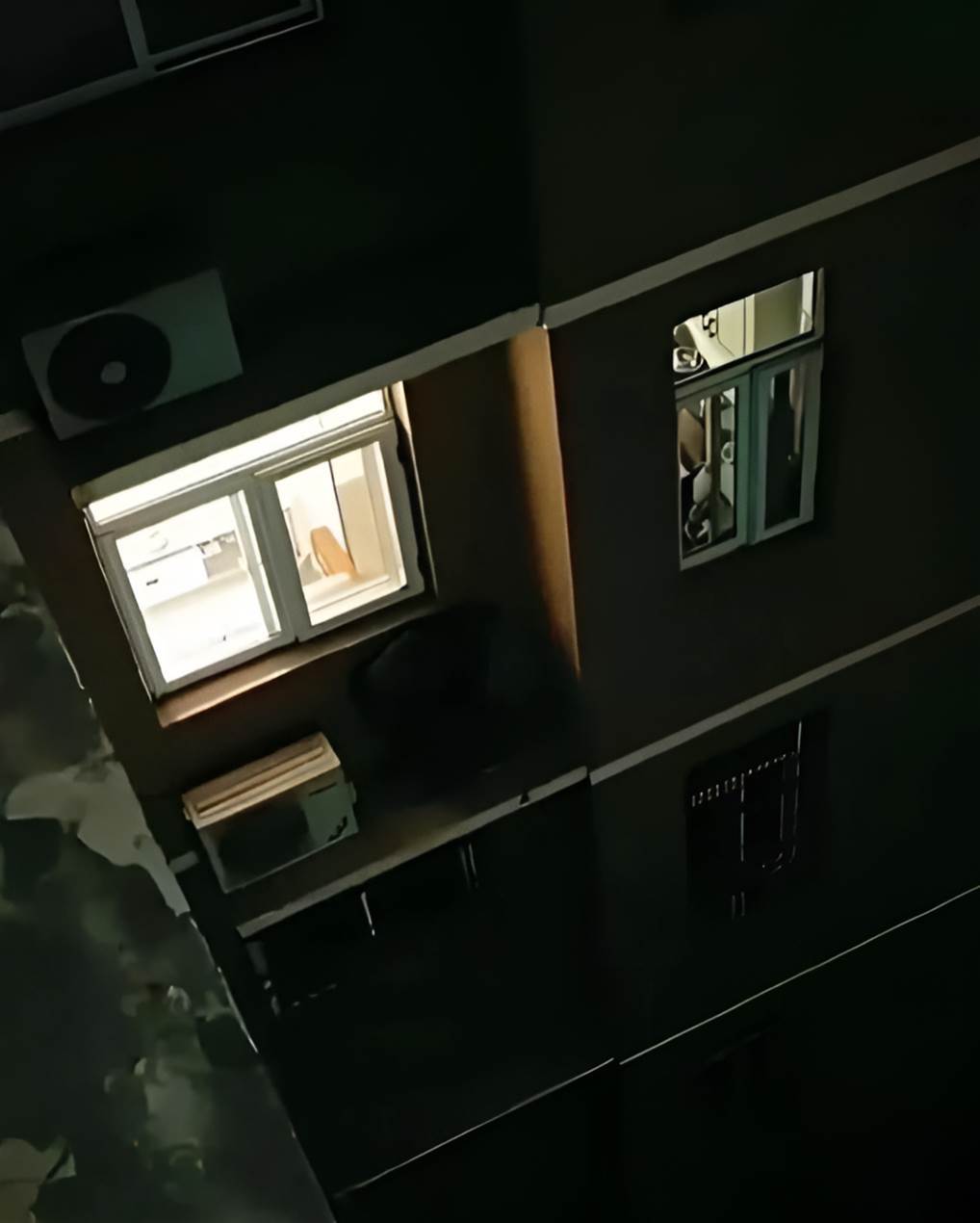 滑桿一推,原本藏在暗處的細節慢慢浮出來。那片原本看不太清楚的右下角,在曝光拉高後,竟然出現一個模糊的人影——像是一名男子,側身站在窗外那條超窄的平台上,整個人緊貼著外牆,好像在躲什麼似的。
