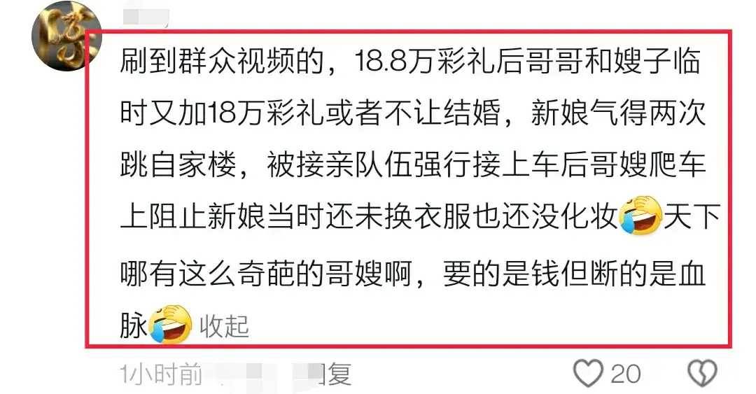 有網友爆料:新郎已經給過18.8萬彩禮后,哥哥和嫂子臨時又加的18萬彩禮,不給不讓結婚。新娘氣的兩次跳自家樓,被接親隊伍強行接上車后,哥嫂趴車上阻止新娘。