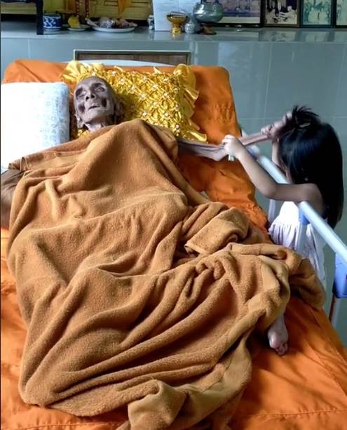 影片中的主角是泰國僧人朗普艾 (Luang Pho Yai),一名年過百歲的人瑞。他全身瘦弱、面容乾癟,眼窩深陷的模樣讓人不禁聯想到「活木乃伊」。影片在TikTok上瘋傳後,不少網友推測,他可能正在效仿日本佛僧進行「自我木乃伊化」修煉,企圖成為「肉身菩薩」。甚至有人聲稱,這位高僧已經活了163歲,還奇蹟般地維持著生命。