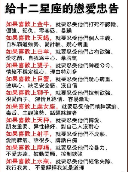 行事風格風風火火的牡羊,離婚或分手不見得是因不夠用心或是外遇,他們個性天生比較直率,做什麼事情很容易因為一股衝動就去執行,在做一件事情之前往往沒有經過縝密思考,牡羊就是標準的沒有腦筋又衝動的行動派,想說什麼就脫口而出,想做什麼就會立刻付諸行動,所以面對感情或是婚姻自然容易分分合合,常常旁人都還沒反應過來,他們都已經將感情處理掉了。