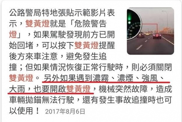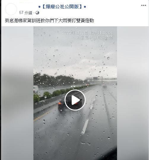 而發文的陳姓網友則語帶抱怨表示『到底是哪家駕訓班教你們下大雨要打雙黃燈勒?』