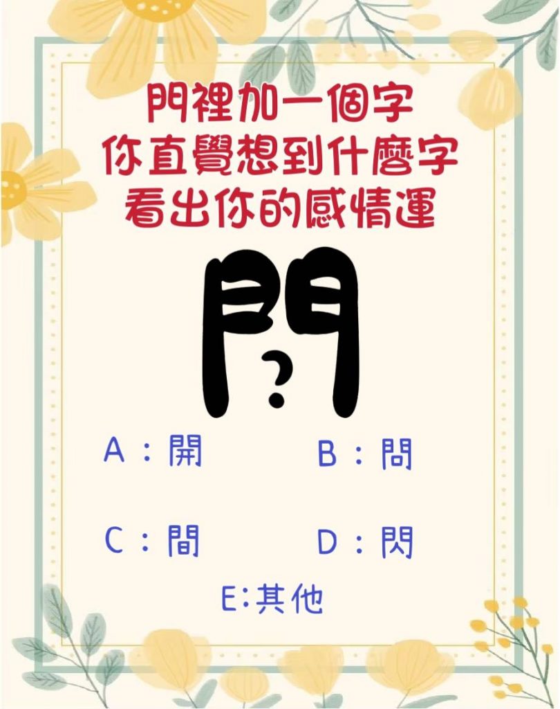 您的測試結果:假如你還在單身,這段時間很可能會遇到你的真愛,而且是很重要的人,會影響你整個往後的人生。 假如你有另一半,你們的感情很穩定,幾乎沒有什麼可以影響你們了,如果是有想要結婚的人,有這方面的打算,可以開始好好規劃了。