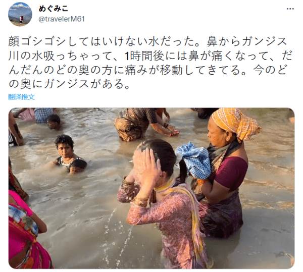 惠子身穿印度傳統服飾,赤腳走入河水,面對晨曦雙手合十。一切看上去頗有儀式感。然而,接下來的一幕卻讓所有觀看視訊的日本觀眾倒吸一口冷氣:惠子捏住鼻子,直接將整個人沒入河中,甚至用雙手捧起河水反覆洗臉。