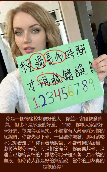 你有很好的修養,遇到無理取鬧的事情,你通常是一笑置之,你並不會真正的發起脾氣來,但是若你遇到真的很白目的人,你還是會漸漸地疏遠他,並不會撕破臉。不過你也不是沒有脾氣的,只要不要踩到你的地雷,大家就相安無事,一旦誤入禁區,那可就嚇人了!
