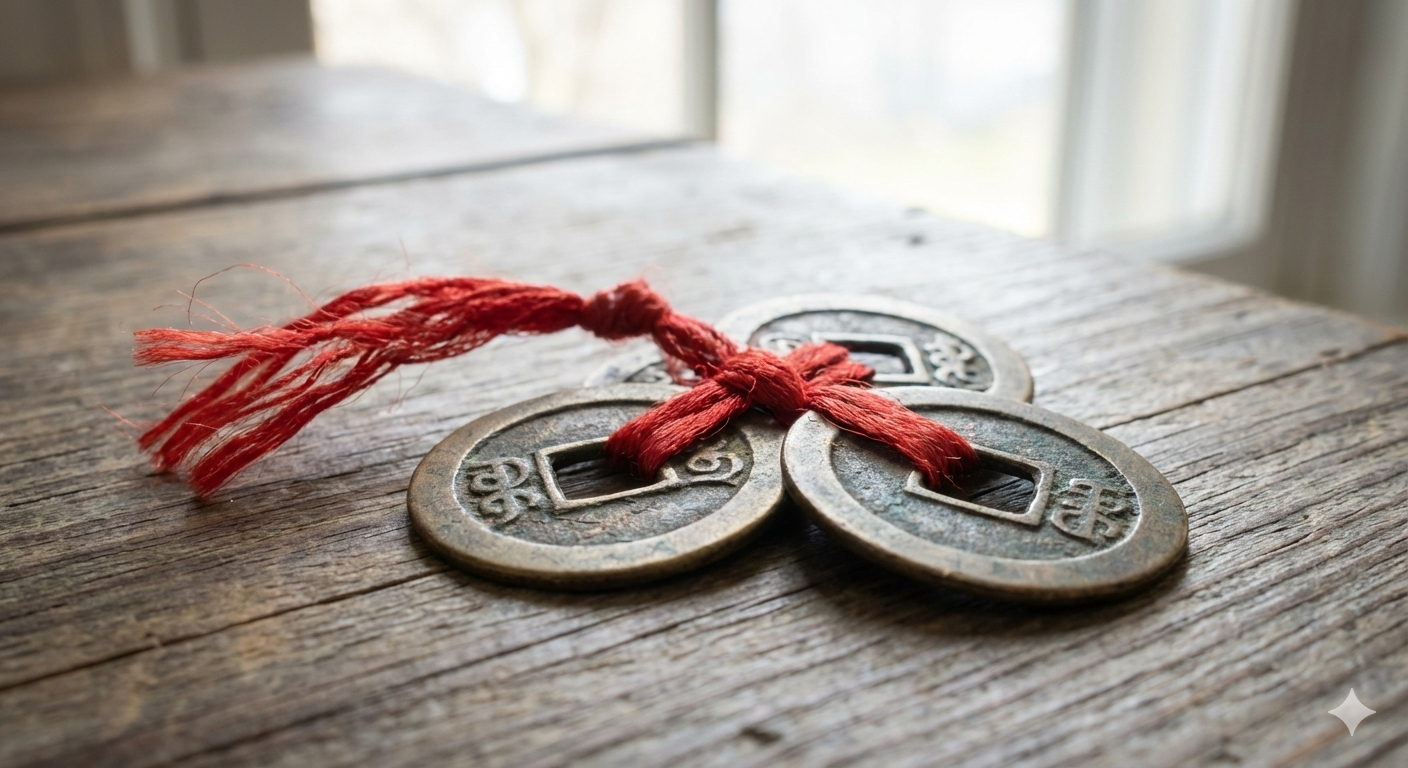 這個神祕的東西就是:【三枚繫著紅線的銅板】