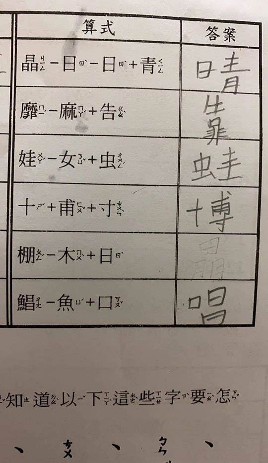 從照片中可看出國文老師用算數學的方式寫下例如:「晶-日-日+青」、「娃-你+蟲」等字樣要孩子猜出會變成哪一個中文字,但其中「棚 -木 + 日」這道題卻想破頭也想不到,還可以看見隱隱約約有擦布擦掉的痕跡。