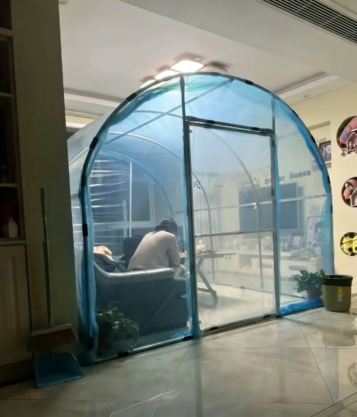 這張引發熱議的照片顯示,客廳沙發區被一個類似簡易溫室的塑膠暖棚緊緊包圍,親戚正坐在裡面舒適地滑手機。