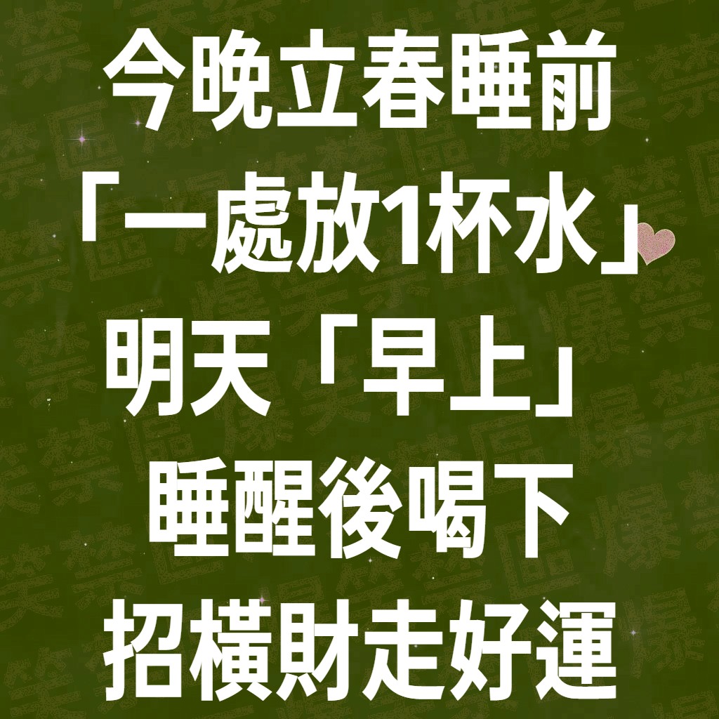 在命理學中,立春這天的水能吸收天地初開的靈氣。只要今晚睡前,在妳家中的「關鍵水位」放上一杯水,讓它靜置一夜吸收立春的財氣,明天一早喝下去,就是把整年的橫財運灌進身體裡!留言**「水到渠成,財源滾滾」**,立刻開啟妳的馬年接財儀式!