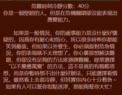 異性緣指數是100% 是個魅力十足的人,因為你十分懂得自己的優缺點,再加上又是個有自信的人,因此在異性眼中你有一種魅力。你不只有美麗或帥氣的外型,而且有幽默大方的性格。你應該是一個很有氣質的人, 所以從小到大,你的異性緣都相當好,周遭總不乏愛慕者。