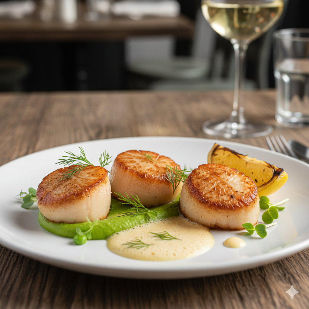 B. 精緻儀式感的【法式乾煎干貝】: 擺盤優雅,搭配頂級松露與白酒。