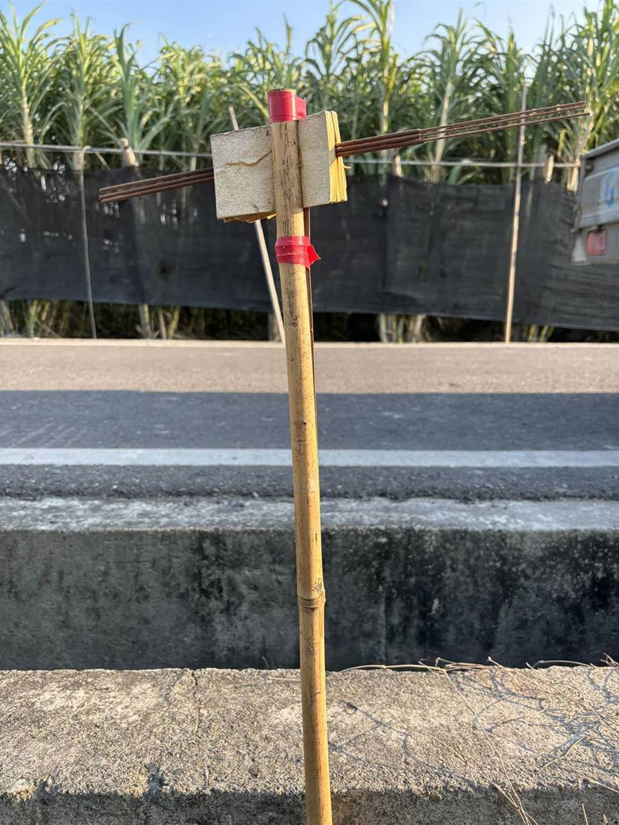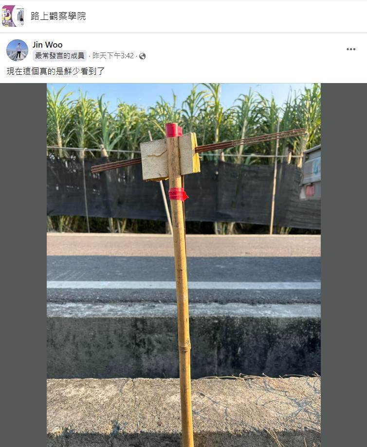 原PO在臉書社團「路上觀察學院」上PO出這張照片,只見照片中,一根竹竿就插在田埂邊,竹竿頂部則被劈開並夾了一疊金紙,而金紙中間又橫地夾了三柱香、上下則以紅色膠帶纏繞固定住竹竿劈開處,看起來像是什麼儀式之類的。