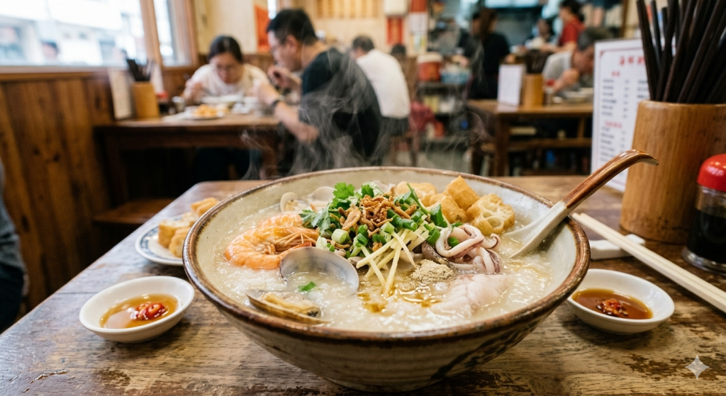 A: 一碗熱騰騰、配料豐富的鹹粥(皮蛋瘦肉粥或海鮮粥)