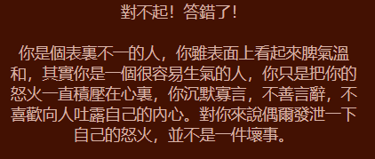 你的行事作風偏保守,從你的潛意識來看,你認為自己還不夠成熟,所以當你遇到問題時,最先想到的是父母,你很依賴他們,沒辦法憑著自己力量過生活。雖然說有父母的照顧是好,但缺點是較容易養成依賴心而不夠獨立,因為總有一天你需要自己成長。