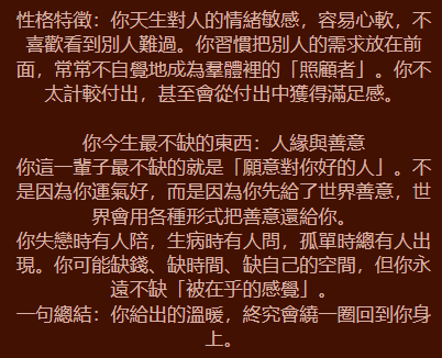 喜歡奇異果的話,代表你給人的第一印象是冷靜理性,遇到再大的困難,都能處之泰然,只要別人沒觸碰到底線,你也不會輕易發脾氣,且任何事情都希望做到最好,有一點點完美主義。