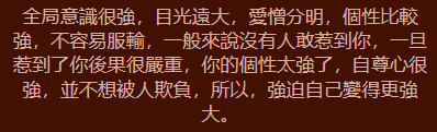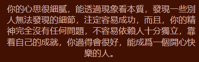 你是個喜歡未雨綢繆的人,對未來的事情都會想得很完整透徹
